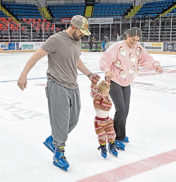 Parents Jordan Brister, left, and Brittany Brister steady their daughter Brayleigh Brister, 2, as she ice skates for ther first time on opening night of Skating on the River at the Raising Canes River Center on Thursday.