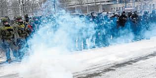 In Minneapolis, snowballs and water balloons were also thrown before an armored police van and heavily equipped city police arrived.
