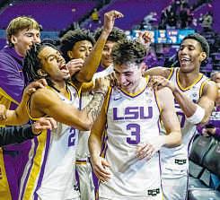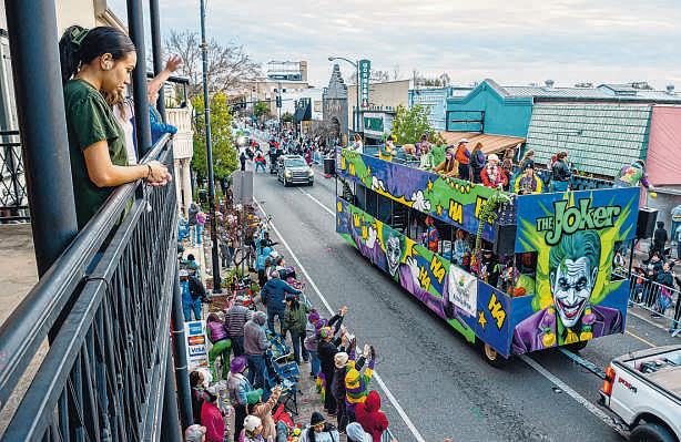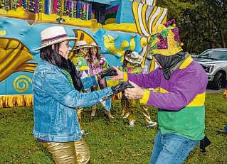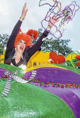 ABOVE: Katy and David Larson dancebefore riding in the Bayou MardiGras Association parade in New Iberia on Saturday TOP: The Bayou Mardi Gras Association parade rolls on Saturday RIGHT: Krewe memberssend throws to the crowd duringthe parade.