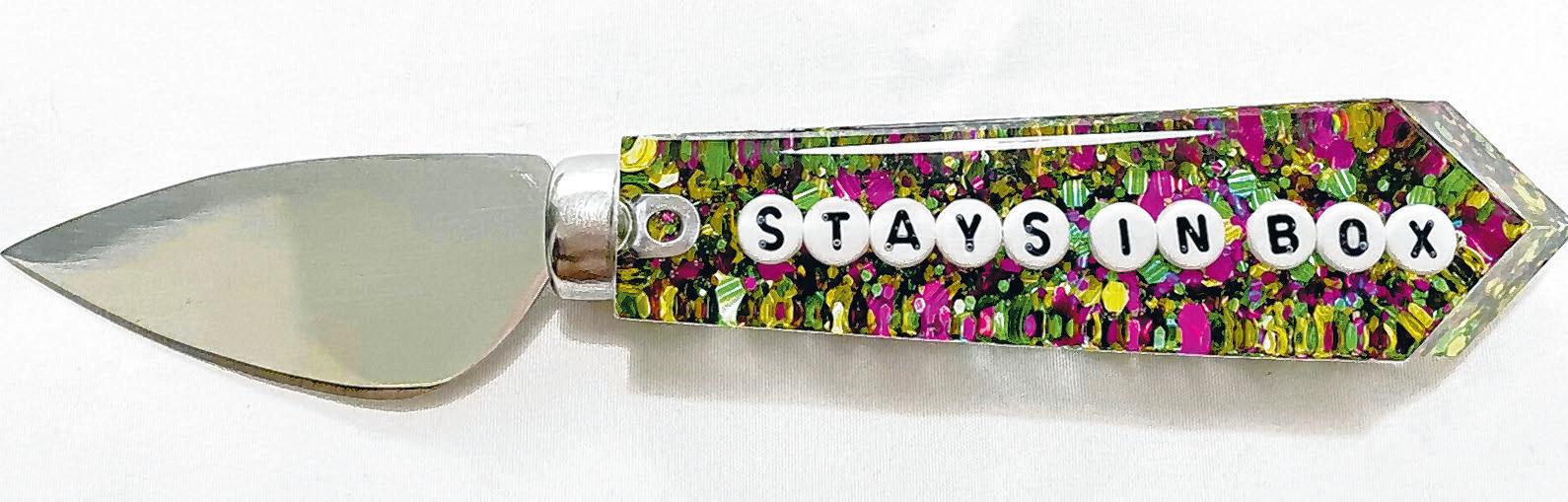 Ikeda tapped into her passion for crafting and created a handfashioned knife with epoxy and glitter She also carefully placed beads on every knife handle to spell “Stays in Box.”
