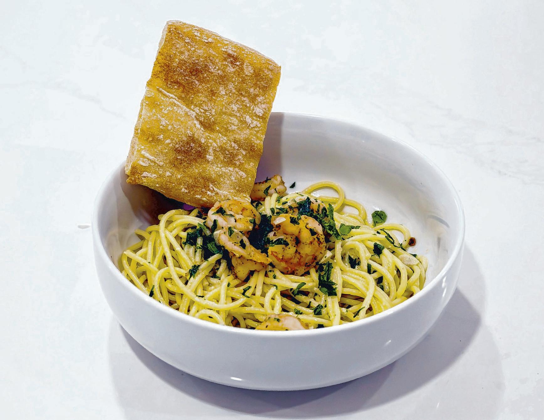 A finished bowl of Michael DiResto’s shrimp and spaghetti with bread