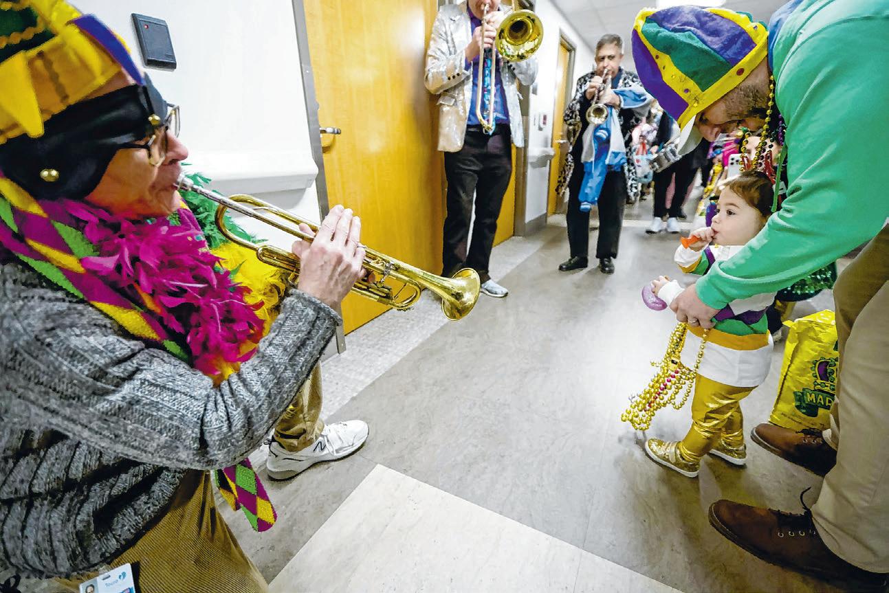“Our first song is ‘Down by the Riverside,’ followed by ‘When the Saints Go Marching In,’” he said. “We play many more songs including ‘You Are My Sunshine’ and ‘Mardi Gras Mambo.’ The patients get to experience Mardi Gras in a most unique and accommodating way.”