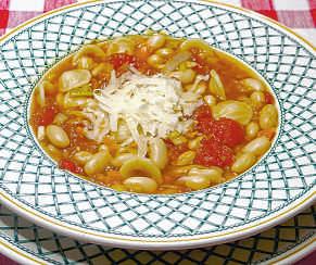 according to package instructions. Drain. 4. Whensoupisready, add the pasta and simmer 3minutes.Ladle warm soup into two soup bowls. Add salt and pepper to taste. Stir to combine ingredients in bowl. Sprinkle Parmesan cheese on top.