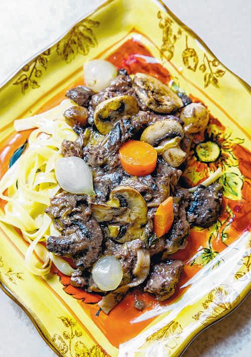 6. Addthe mushroomsand leekstothe beef pot. Stir andsimmer for10minutes If thesauce is too thick, add thebeefstock andstir.Add the bacon back into thepot and remove the tea ball. Serve over potatoes or wide pasta, like atagliatelle.