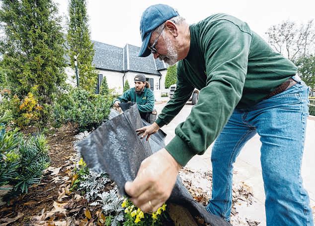 Gabriel Gonzalez, right, and Humberto Espinoza with Paradise Plantscapes coverplants at ahomeonWestBayou ParkwayonFridayahead of freezing temperatures