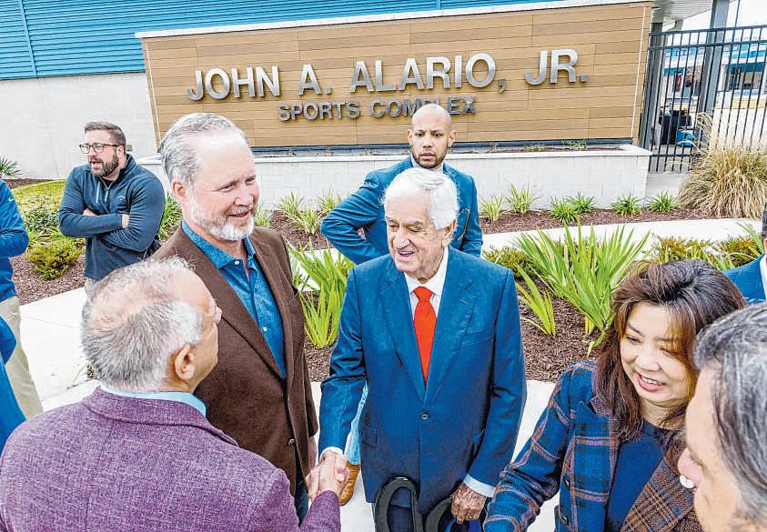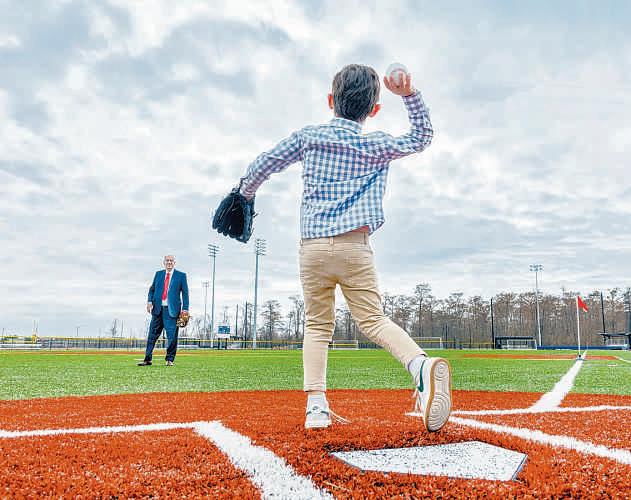 John Alario Jr formerpresident ofthe Louisiana Senate and former Speakerofthe Louisiana House of Representatives, throws abaseball withhis grandson, Maddox Alario, 6, followingthe dedication ceremony of the newJohnAlarioJr. youth Sports Complex in WestwegoonFriday.