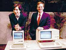 AppleCEO StevenP Jobs, left,and President John Sculleypresent the newMacintosh Desktop Computer on Jan. 24, 1984, at a shareholder meeting in Cupertino, Calif.