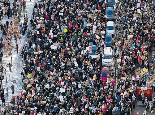 MINNEAPOLIS— Police arrested about 100 clergy demonstrating against immigration enforcement at Minnesota’slargest airport Friday, and thousands gathered in downtown Minneapolis despite arctic temperatures to protest the Trump administration’scrackdown.