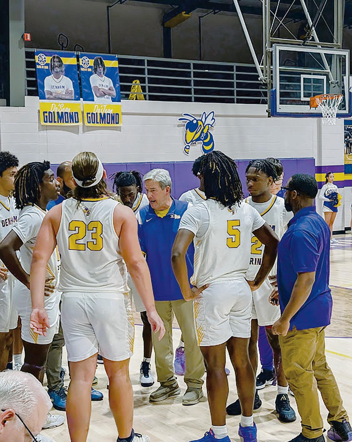 PHOTOS BY CHARLES SALZER Denham Springs High School basketball coach Kevin Caballero, center, Hayden Ray (23) and Da’Jean Golmond (5)