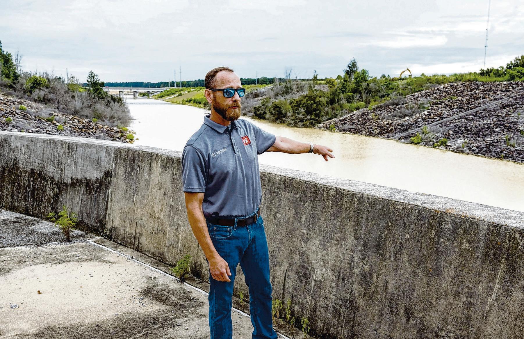 P.J. Varnado, the branch chief for the Baton Rouge Integrated Projects Office, gives a tour of the finished control structure near Lilly Bayou on Aug. 19, 2024 in Zachary. The structure, which was finished in 2011, is part of the Comite River Diversion Canal and slows the 45-foot drop of water flowing from the channel section of the diversion into bottomland swamps along the Mississippi