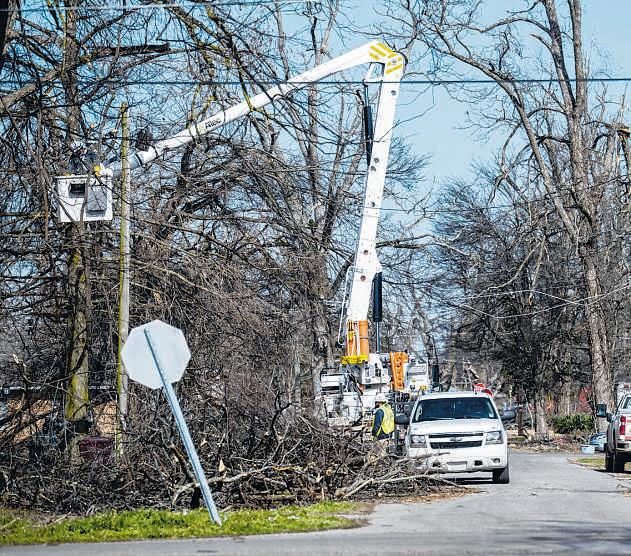 An Entergyutility truck worksonlines along Harding Street in Lake Providence on Sunday.
