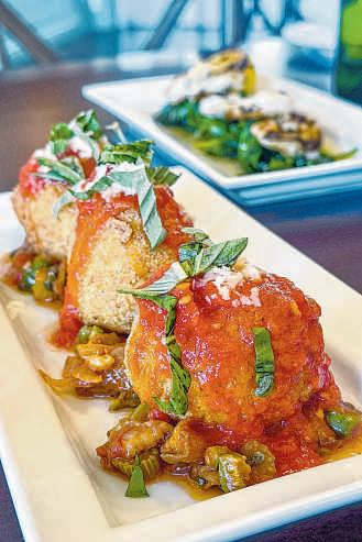 It’sthen placed on abed of caponata, an Italian eggplant and sweet-and-sour relish, topped with tomato sauce and sprinkled with Parmesan cheese. Hisother favoriteappetizer is the bruschetta with house-made focacciawith mozzarella, tomato, basil and balsamicvinaigrette