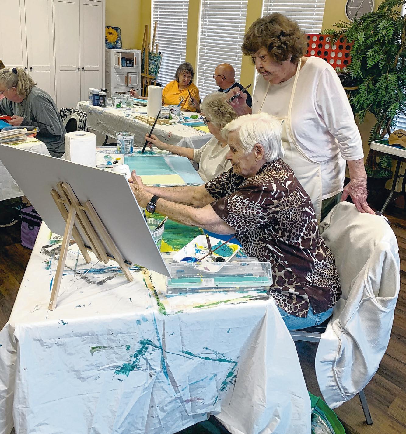 Painting teacher Caroline Harrell helps class member Bobbie Bond. The white cabinets, used for painting and quilting supplies, are a recent purchase made with some of the funds raised for the art department.