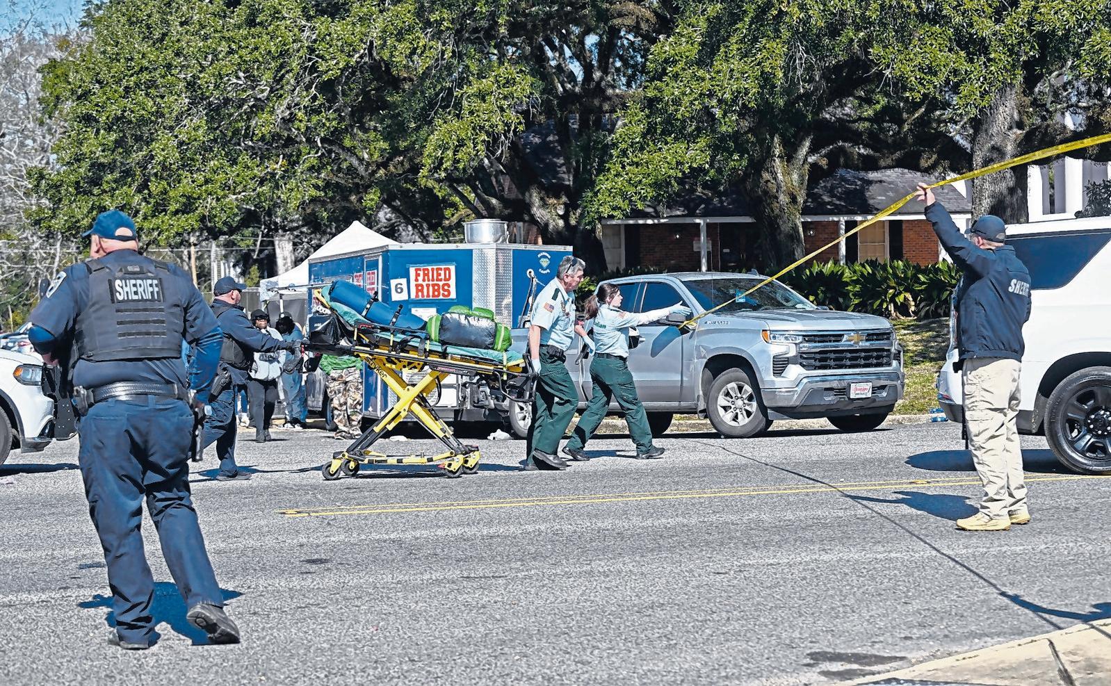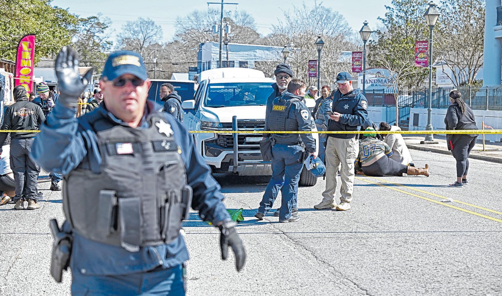 Law enforcement and emergency crews work the scene of a shooting at the Clinton Mardi Gras Parade.