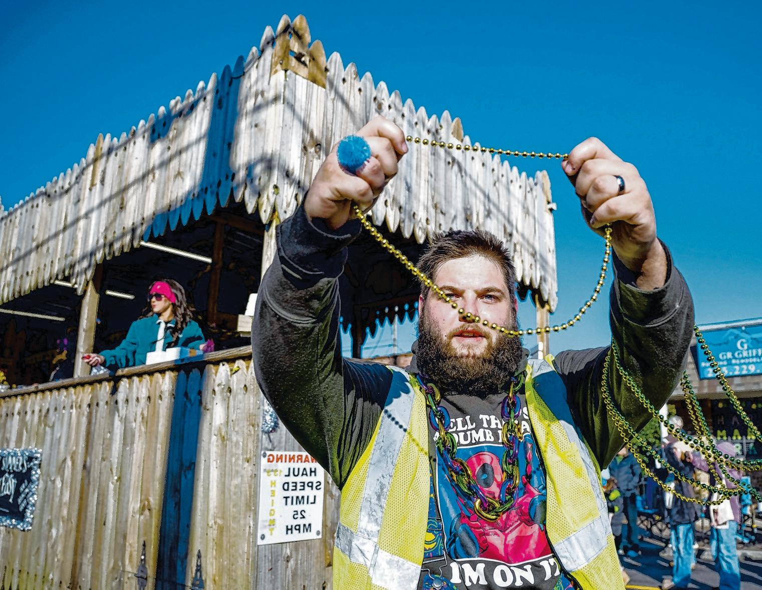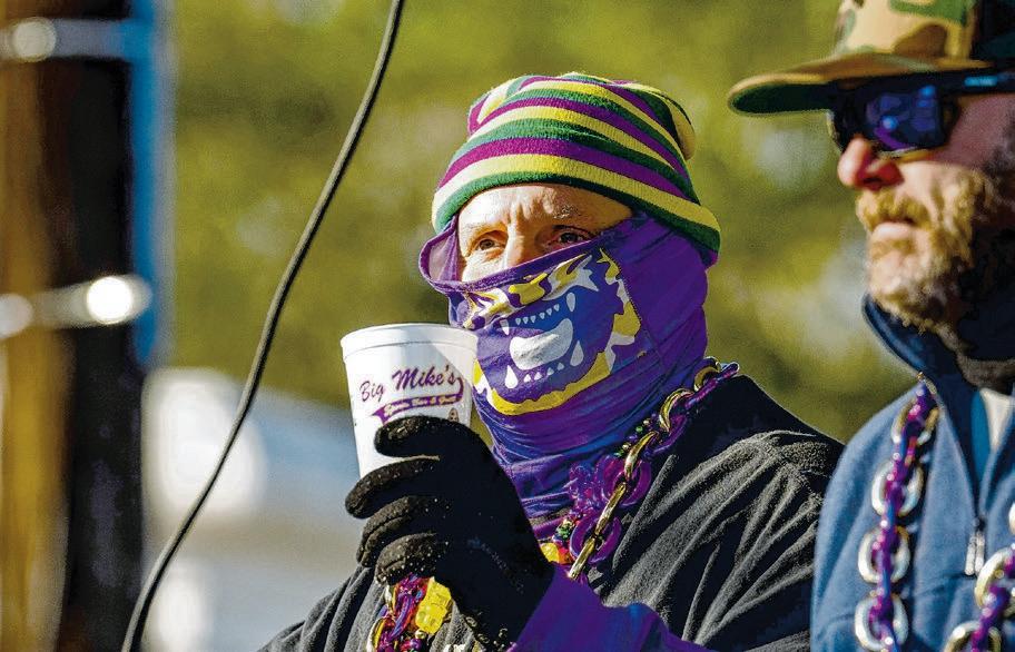 A rider on the float for Big Mike’s bundles up during a cold and windy Krewe of Denham Springs Mardi Gras parade.
