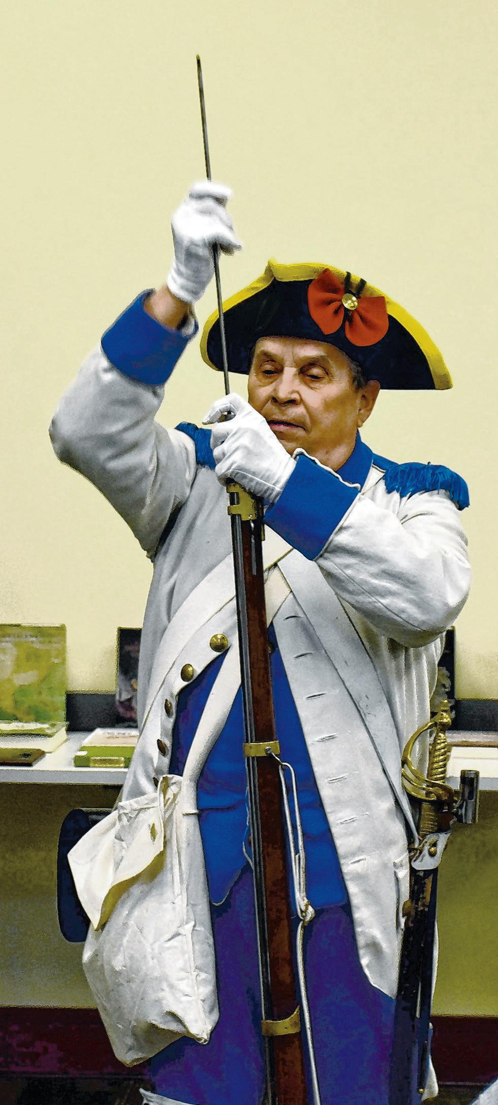 Steve Estopinal, a member of the Sons of the American Revolution Color Guard, displays how to load the type of rifle used in the American Revolution.