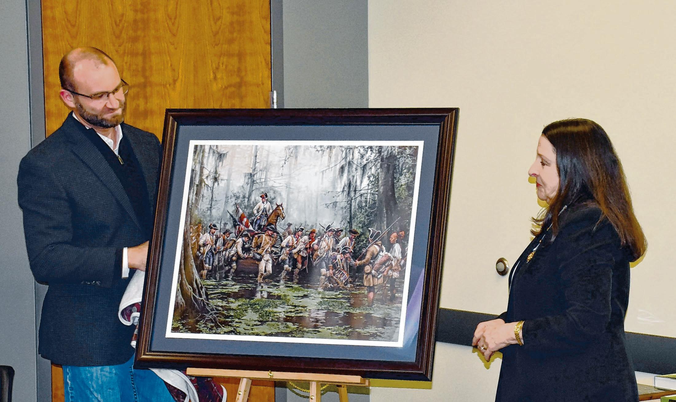 Judge Matthew Belser left, and Judge Brenda Bedsole Ricks unveil Augusto Ferrer-Dalmau’s painting of ‘La Marcha de Galvez’ that was presented to the citizens of Livingston Parish during The Edward Livingston Historical Association’s commemoration of the 250th anniversary of the United States of America at the Livingston Parish Courthouse on Jan. 17.