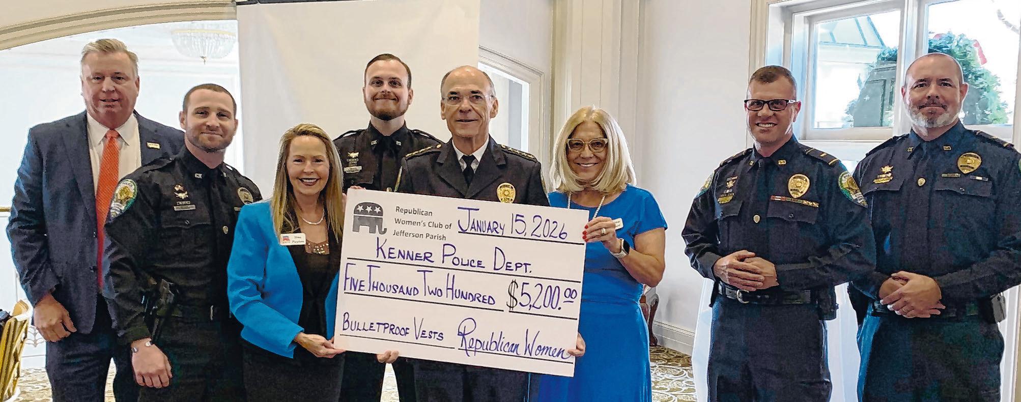 The Republican Women’s Club of Jefferson Parish donated $5,200 to the Kenner Police Department to purchase four bulletproof vests. Pictured, from left on the front row, are Tina Payton, club president; Keith Conley, Kenner chief of police; and Debbie Albert, club treasurer; back row, Mike Glaser, Kenner mayor;