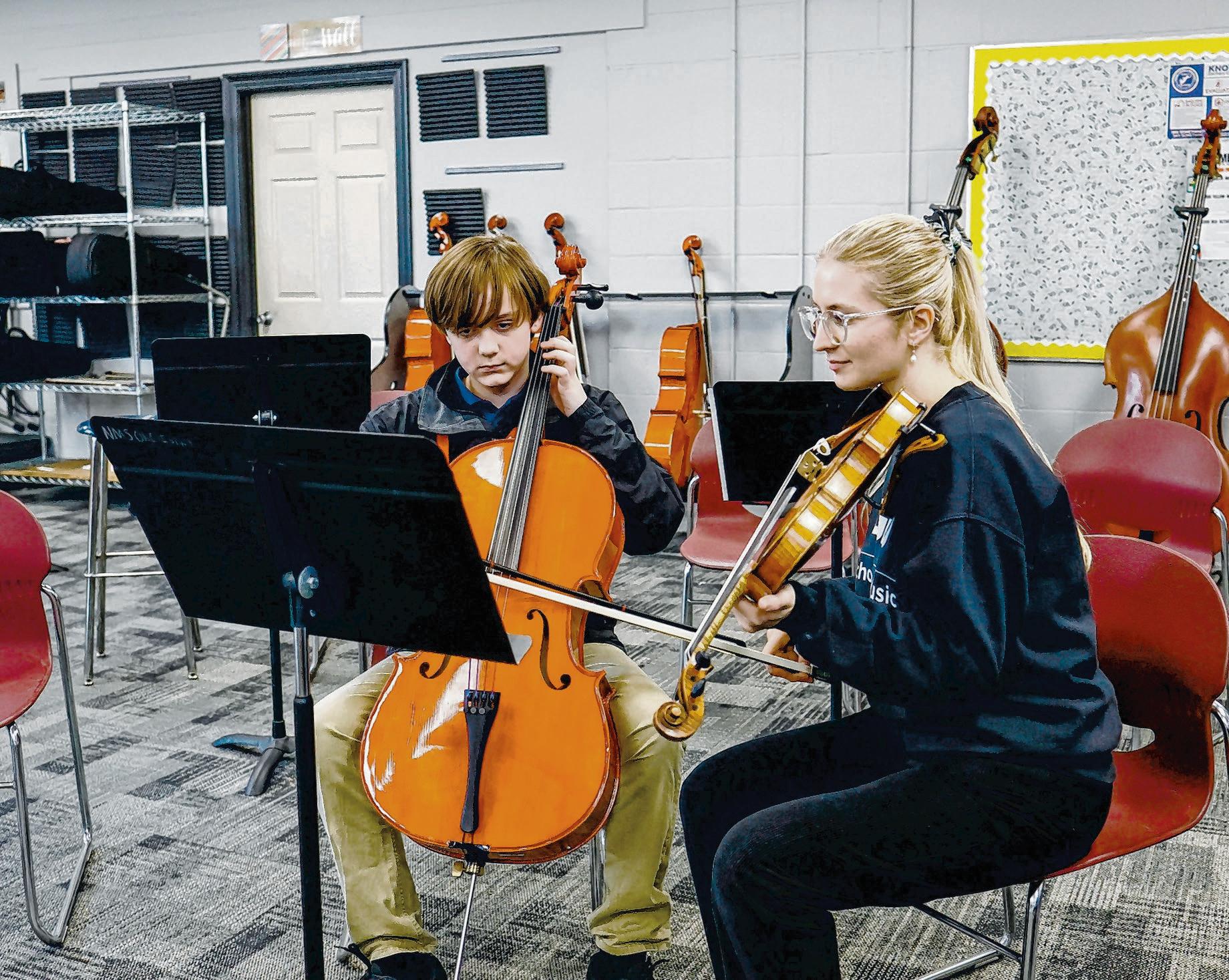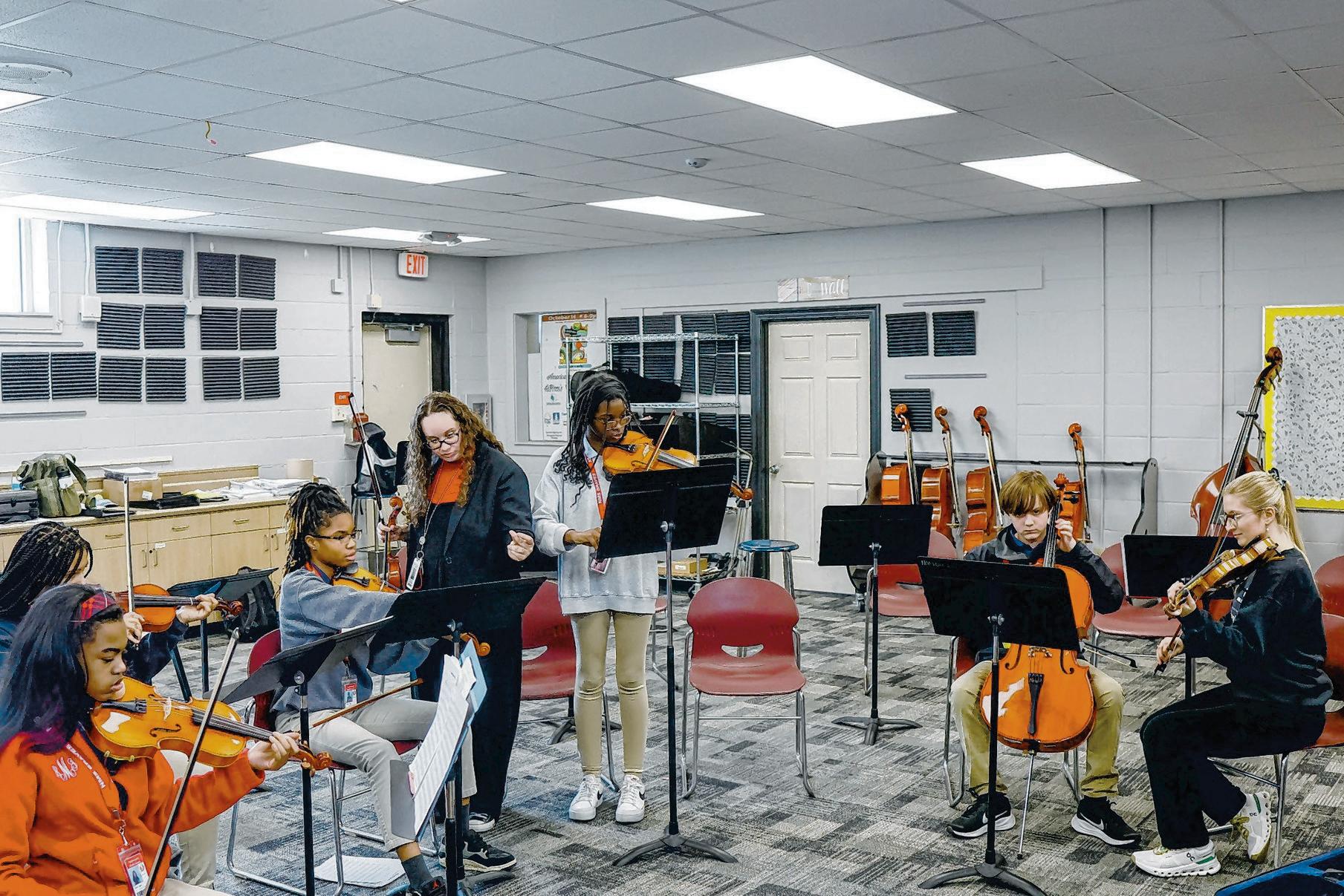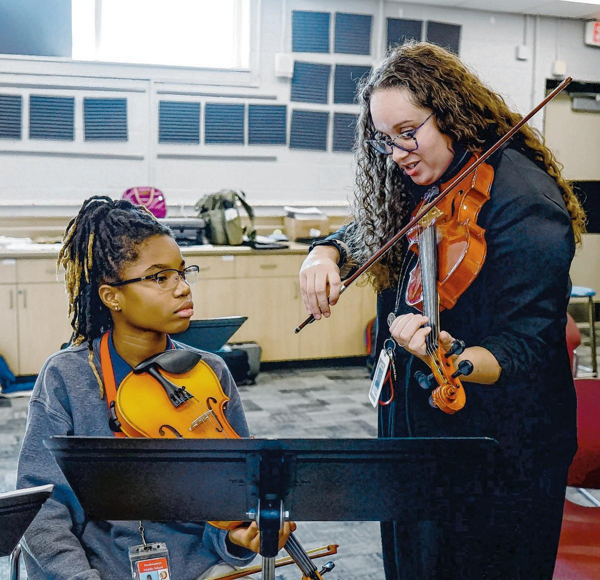 Orchestra instructor Alicia Monroe plays a section on her violin for Northwestern Middle eighth grader Haleigh Goss to provide Goss some tips.