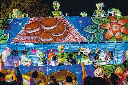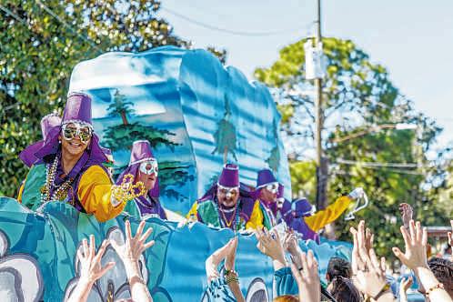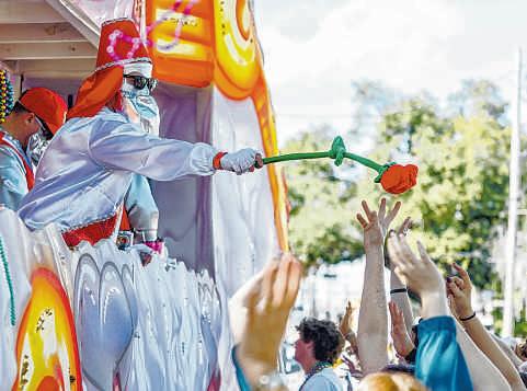 LEFT: The Krewe of Athena rolls with700 members on 26 floats along Veterans Memorial Boulevard in Metairie on Sunday to the theme ‘It’sAbout Time.’