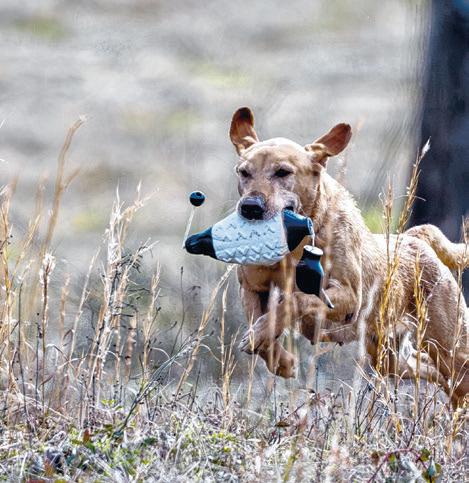 Zest holds a dead duck in its mouth after capturing it during training at Anderson Farms in Ethel on Jan. 21. Wager sprints beck to handler Lyle Steinman with a duck dummy