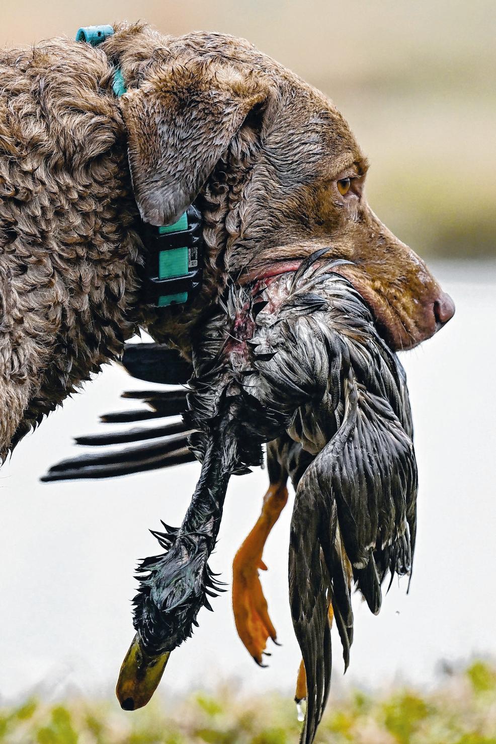 At the end of January, the season’s first challenge unfolds in the “hunt test” style. Harley steady beside McCall, watches as a bird tech throws the first bird — or “mark” — 184 yards straight ahead, across a pond and a cluster of decoy ducks Bird No. 2 follows at 64 yards, landing in the same line of sight. Bird No. 3, the “poison bird,” drops 50 yards out and near the water’s edge. Finally, bird No. 4 flies 101 yards directly to Harley’s left Each launch is accompanied by the sound of a shotgun blank fired from the bird tech in the field McCall
