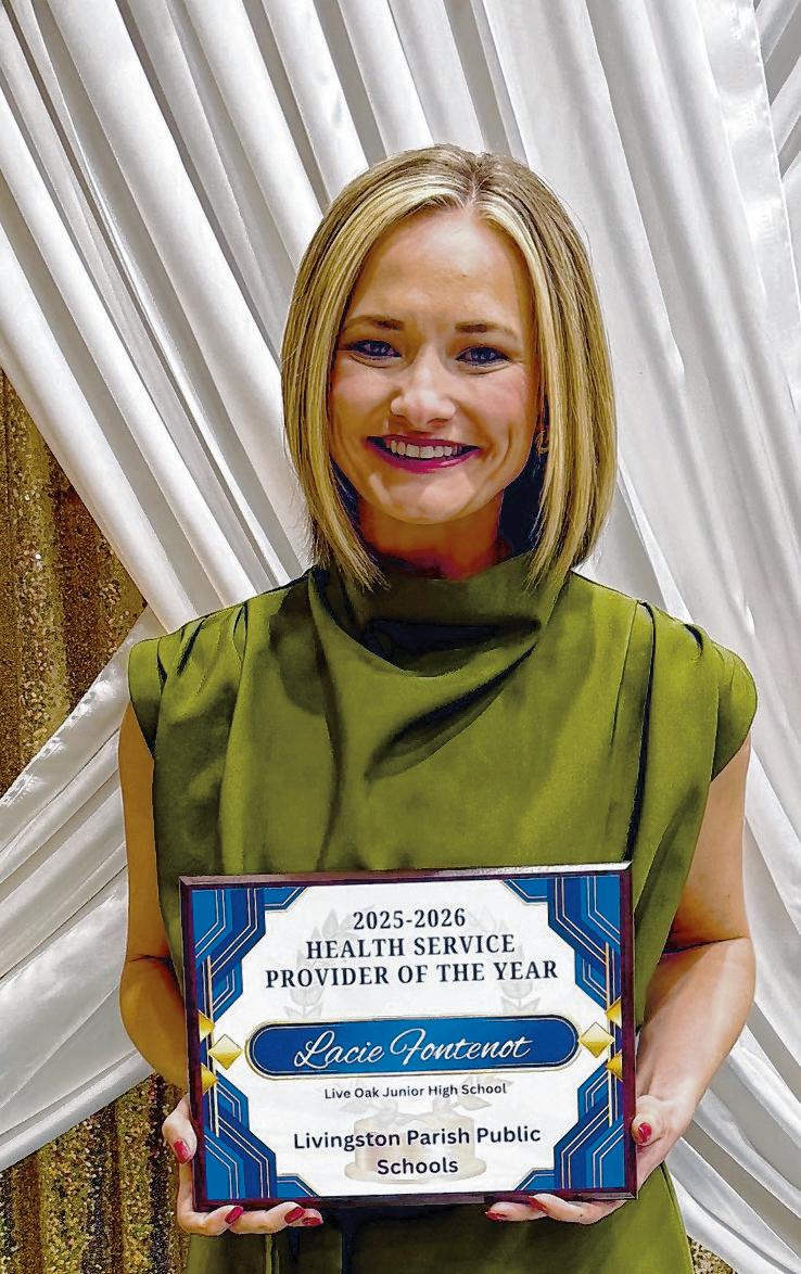 Livingston Parish Public Schools Teachers of the Year: Elementary Teacher of the Year Courtney Blount, Frost School; Middle School Teacher of the Year Cady Harrell, Southside Junior High; High School Teacher of the Year Cortney Haser, Denham Springs High; and New Teacher of the Year Grace Reynerson Live Oak High. Support Staff of the Year: Kimberly Van Dinther, Walker Junior High. Health Service Provider of the Year: Lacie Fontenot, Live Oak Middle.