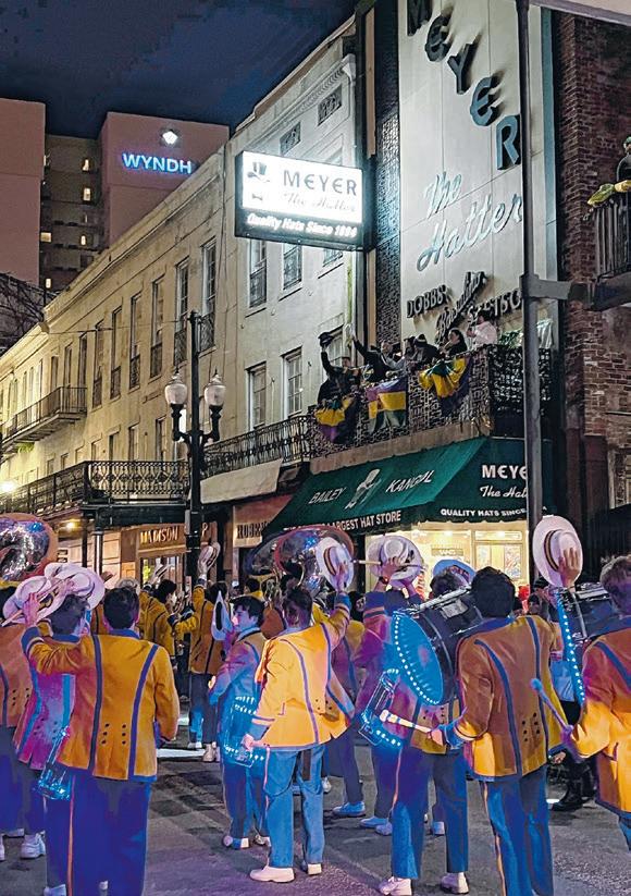 Among Carnival’s elaborate centuriesold customs and quirky parade-day practices lies a subtle tradition of mutual respect between one of the area’s most beloved marching bands and one of the city’s oldest family-owned merchants. Revelers who routinely catch parades downtown in the final stretch of St Charles Avenue may have witnessed this quick but touching gesture when the Marching Wolves of St. Paul’s School in Covington tip their hats as they pass Meyer the Hatter, a New Orleans institution for more than 130 years. In turn, Meyer family and