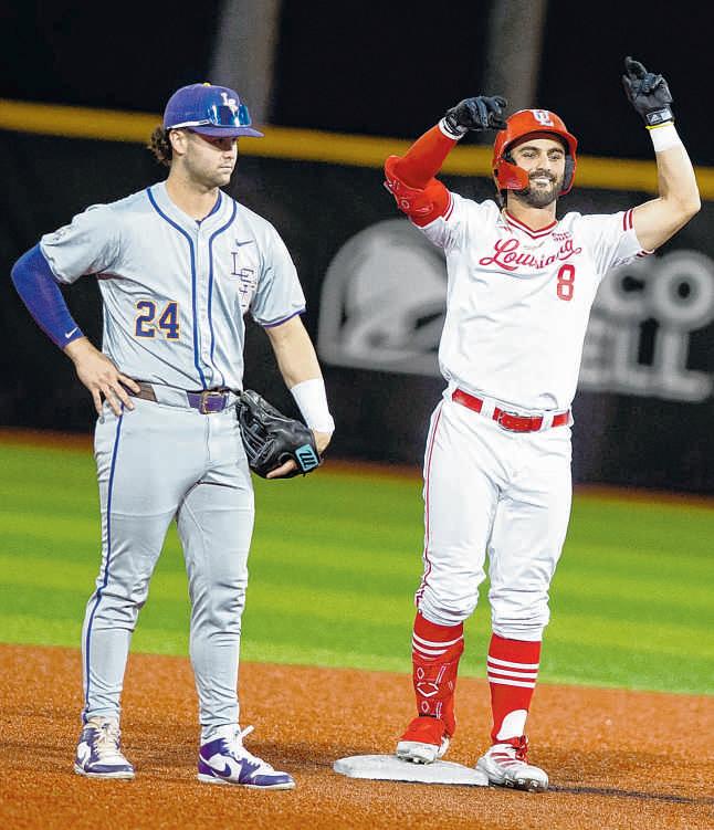 Aselloutcrowd fills the seats at M.L. ‘Tigue’ Moore Field on Wednesdaytowatch the University of Louisiana at Lafayette host LSU. TheCajuns gave the fans somethingtocheer aboutastheyjumped on LSU for threeruns in the first inning andnever trailed, earning a 7-2 victoryoverthe No.2 ranked Tigers.