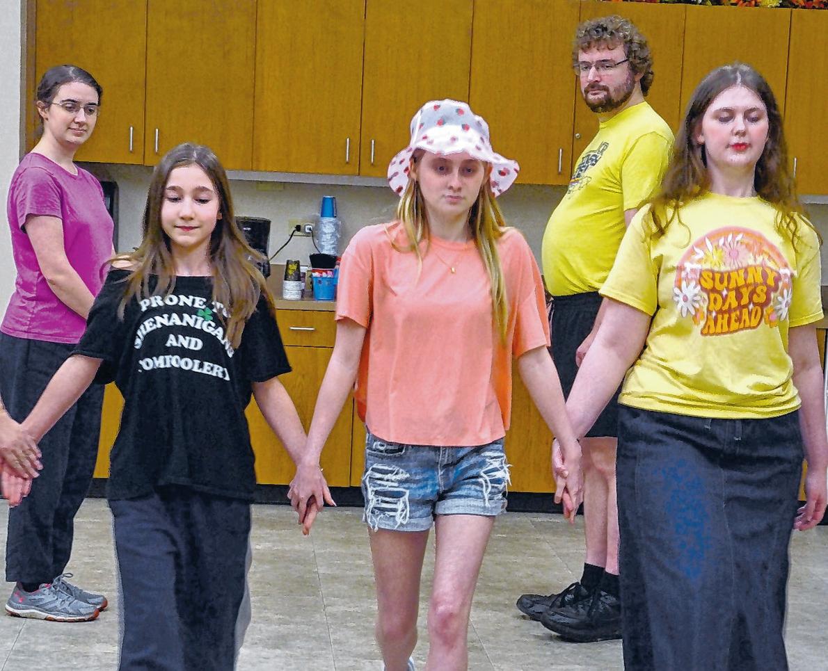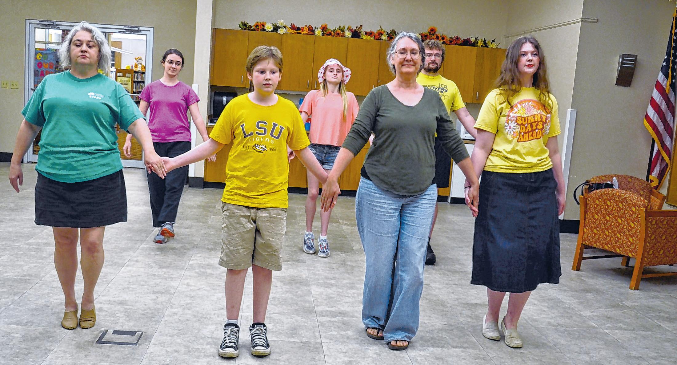 Members of the Lagniappe Historic Dance & Pastime Society meet at the Pride-Chaneyville library Feb 26. They are, from left, Patricia Ladut, Naomi Rossman, Johnny Moffett, Sarah Robertson, Roxanne Struppeck, Jacob Rossman and Naomi Rossman.