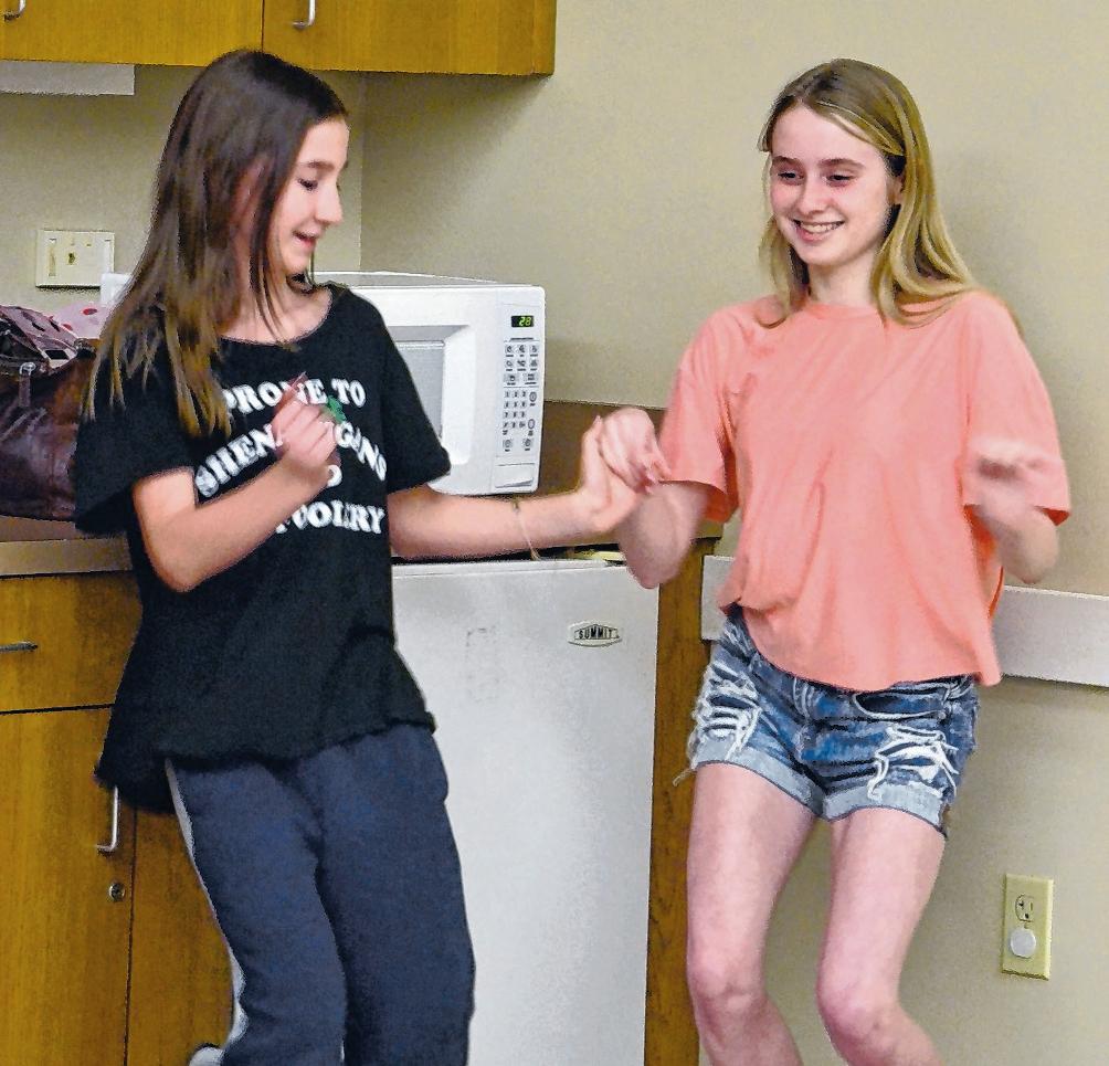 Dancers Rachel Struppeck, left, and Sarah Robertson share a light moment during a break from a practice session.