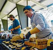 give it acrunchy crust. After thepizzas cool, he builds the pizzas and flash-bakes them.