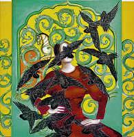 Themore Davépaints, the more the birds morph into something deeper.The colors inher work are always bright,depicting the birds as