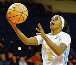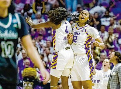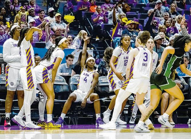 LSU guard Flau’jae Johnson, center,celebrates withthe benchafter Bella Hines,right,hit a three-pointeragainst Jacksonville in the fourth period of Friday’s first-round NCAA tournament game at the Pete Maravich AssemblyCenter.Johnson had 20 points and MikaylahWilliams had 18 points and 10 assists as the Tigers cruised to an easy116-58 win over the Dolphins. Jada Richard scored 17 points and had four steals, and ZaKiyah Johnson added 16 points for the Tigers,who had sevenplayers score at least 10 points ä COMPLETE COVERAGE IN SPORTS,1C.