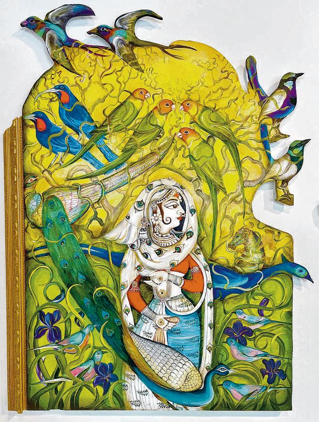 Inkedpieces on large, heavywatercolor paper awaitcompletion in one bedroom,a once-finished wooden cutoutpainting is being revised in another Birds are running themes in all of her paintings, manyof whichfocusonwomen,their place in the world and their plights.