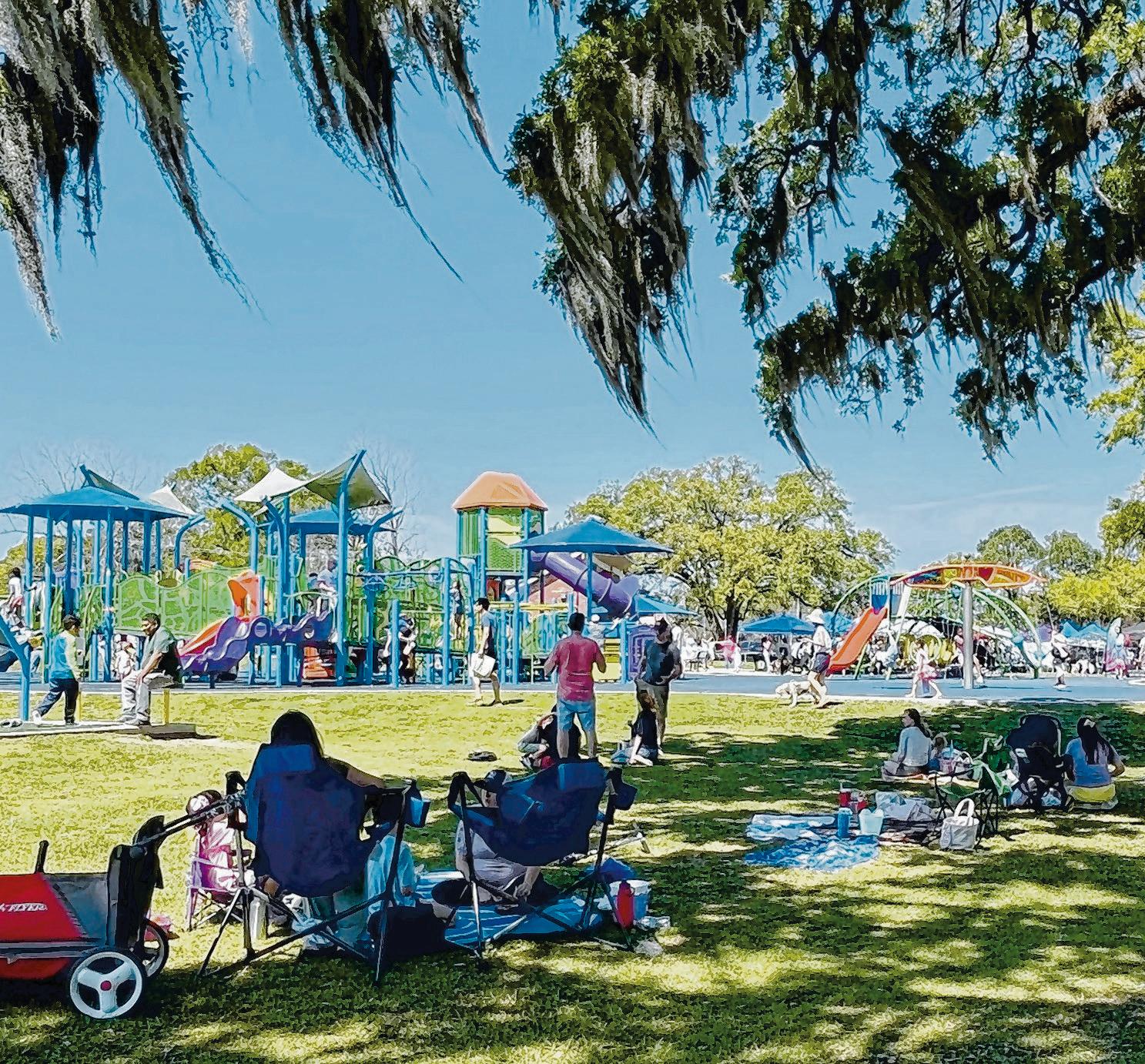 Families relax under the Youth Legacy Duplessis Park oak trees.