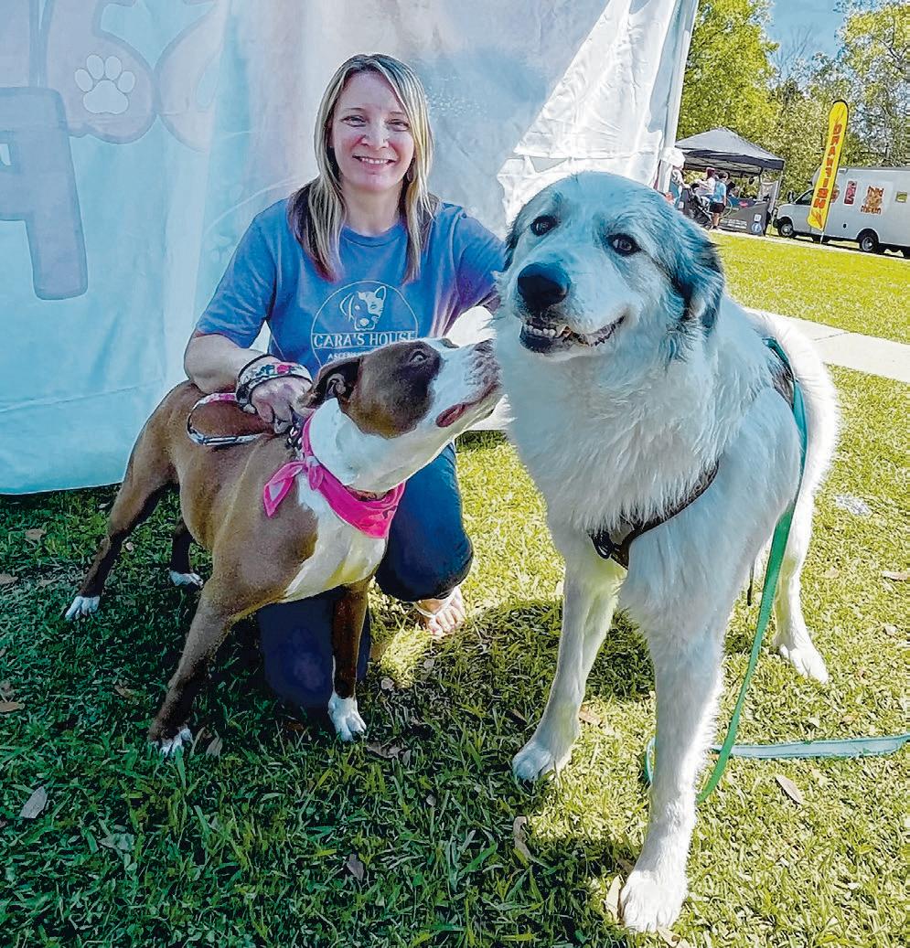 Meechum, a four-year-old Great Pyrenees, right, and Merola, a pitt mix, stand with Cara’s House Volunteer Dog Adoption Coordinator Natalie Albin during Saturday’s Hippity Hoppity Easter Event. Meechum was one of four dogs who were adopted during the event.