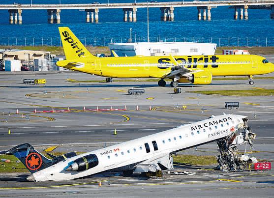 Air Canada Express jet on the side of a runway Tuesday where it had collided with a Port Authority fire truck Sunday night at LaGuardia Airport in New York.