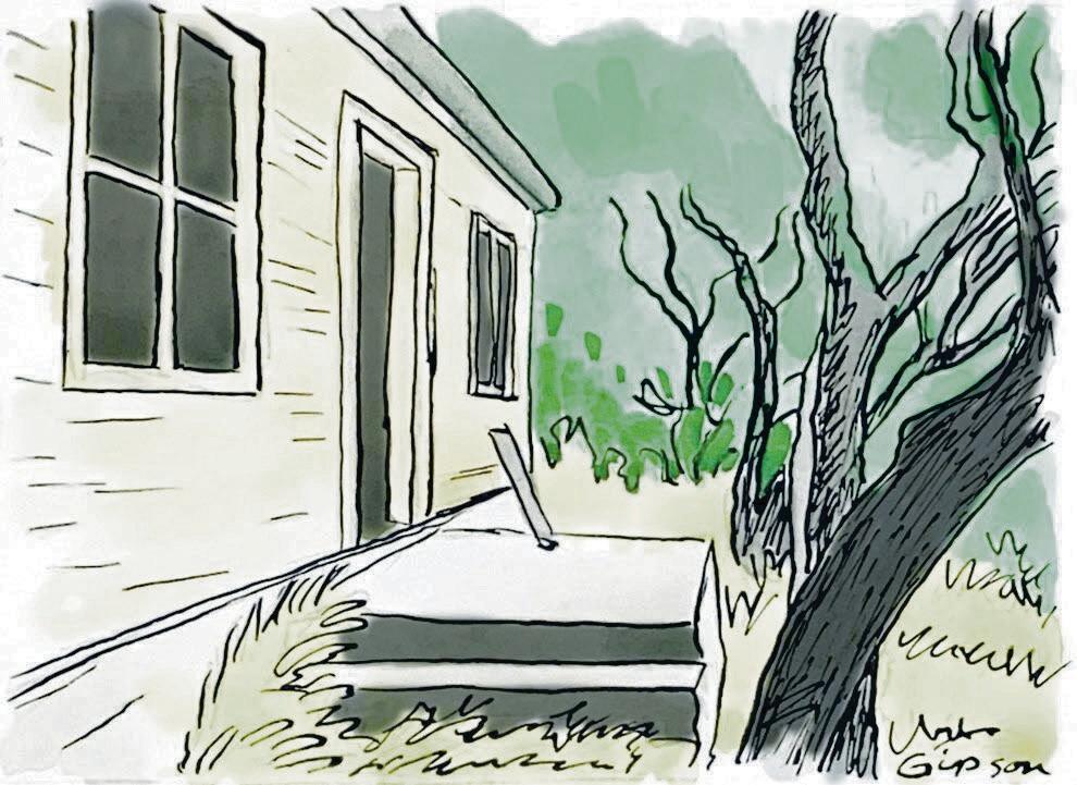 Three decaying and skeletal water oaks, malevolent house crushers-in-waiting, line the front yard