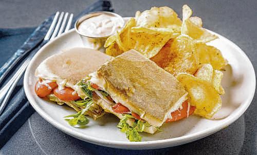There’sappetizers like shrimpscampiwithjumbo shrimp, garlic, herb butter andtoasted chili flakes; stuffed mushrooms with marinated artichokes,breadcrumbs, Parmesan cream andcitrus andherbdressing; andblue crab fritterswith gribiche sauce and chives.