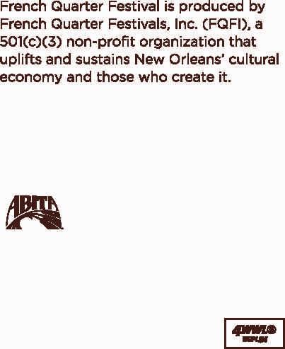 The festival is produced by the eightperson staff of the nonprofit French Quarter Festivals Inc., led by President and CEO Emily Madero. It is supported by sponsorships and food and merchandise sales.