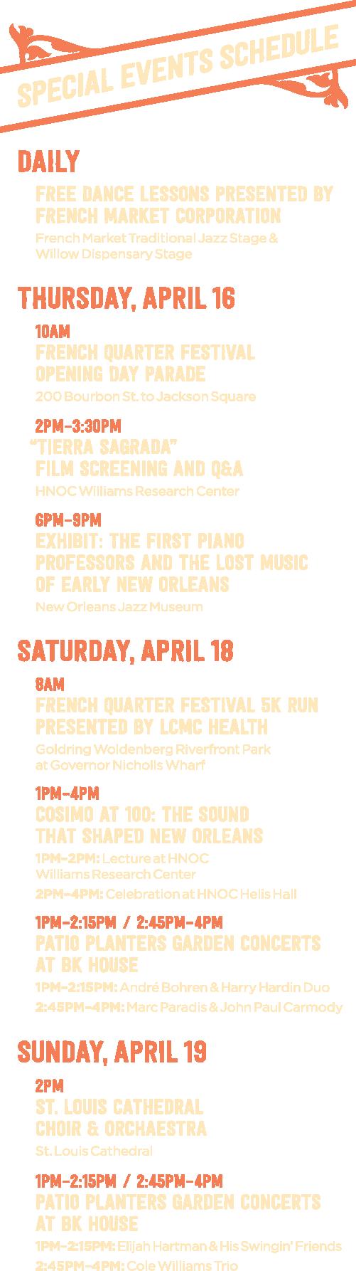 The opening-day parade, populated by sponsors and a few bands, sets out at 10 a.m. from the 200 block of Bourbon Street. It turns on St. Ann Street, heading to Jackson Square, where Preservation Brass will once again kick off the music at the NewOrleans. com Stage at 11:15 a.m.
