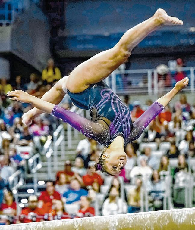 LSUtook the lead after three events withits best rotationofthe day, a49.6125 on unevenbars, that gave the Tigers a148.600-148.5250 lead over the Sooners.LSU then headed to balance beam thesame eventitfinished on when it won the 2024 NCAA title.