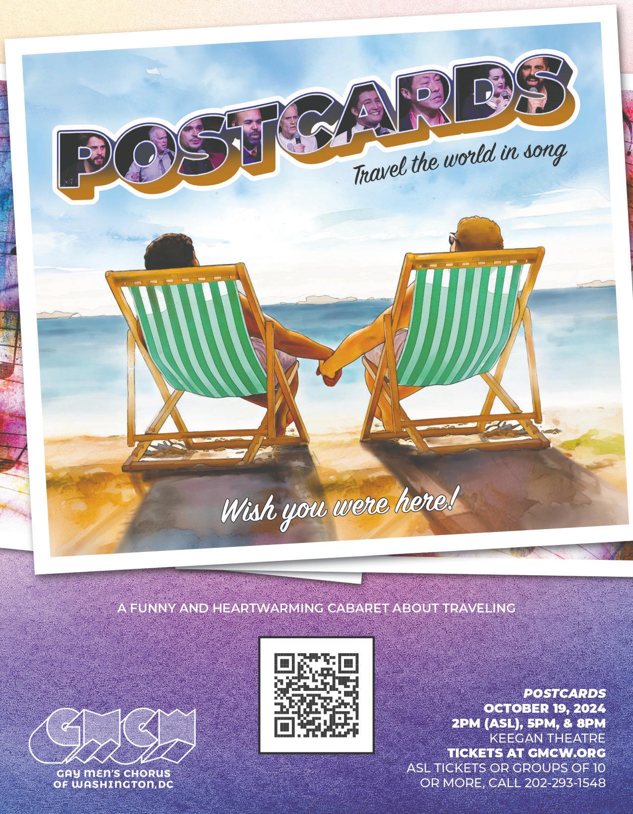 On Saturday, Oct. 19, at 2 (ASL), 5 and 8 p.m., at the Keegan Theatre, 1742 Church St. NW, soloists from the Gay Men’s Chorus will share hilarious and heart-warming stories and songs about the travel adventures they’ve had and hope to have! Songs include “Leaving on a Jet Plane,” “London Calling,” and “I’ll Be Seeing You.” Tickets are $43.50 for seniors or $48. gmcw.org/postcards.