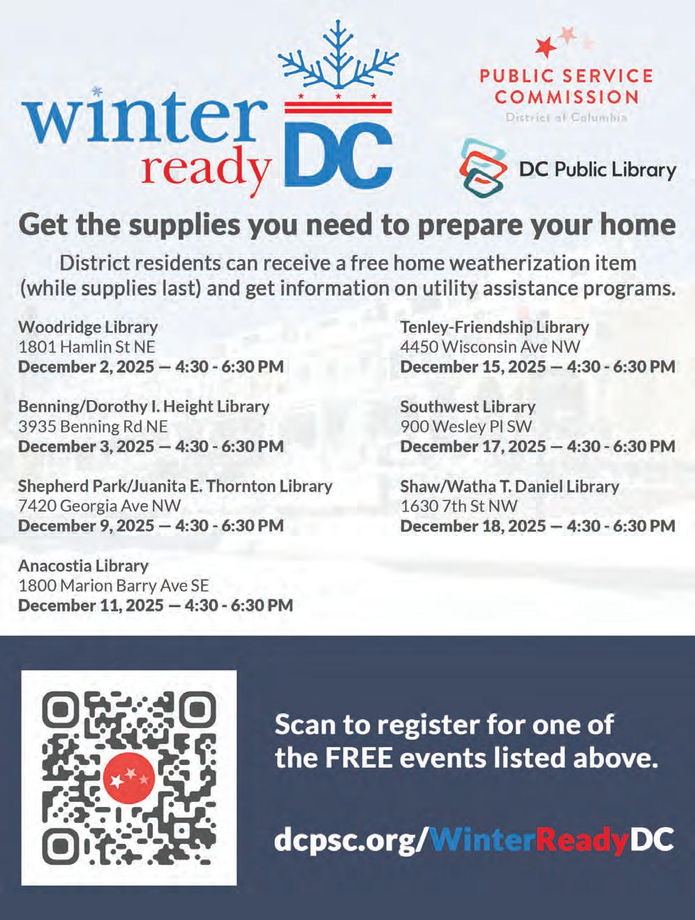 On Sunday, Dec. 7, from 1 to 4 p.m., visit Martin Luther King Jr. Memorial Library, 901 G St. NW, for an afternoon of free holiday fun. is family-friendly festival is packed with creative activities, entertainment and cheer for children of all ages. It features cookie decorating, story writing, art stations, color-your-own mug, a puppet show, face painting, photo booth, storytelling, a DJ and music and mascot characters. www. dclibrary.org