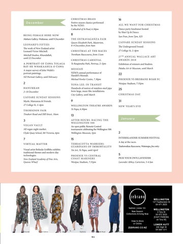 16 AL L W E WANT FOR C H RI STM AS Dance party fundraiser hosted by Shut Up & Dance. San Fran, from 7pm, $25 L’AFFARE SU NDAY SE S SIONS The Underground Sound. 27 College St, 2–4pm 2 7 T H ANN UAL WAL L AC E ART AWARD S 2 0 1 8 Exhibition of winners and finalists.