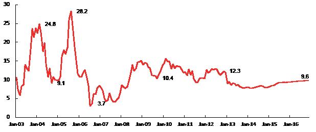 Chart 3: Headline Inflation in Nigerian from 2003 to 2015 (+ 2016 Forecast)