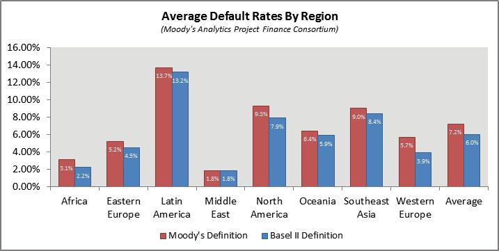 The average default rates by region vary expressively –ranging from 1.8% the Middle East and 2.2% in Africa to 13.7% in Latin American, under Basel II default definition. The former being less than ten defaults in each region for the dataset. Even so, considering the total average default rate is 7.2%