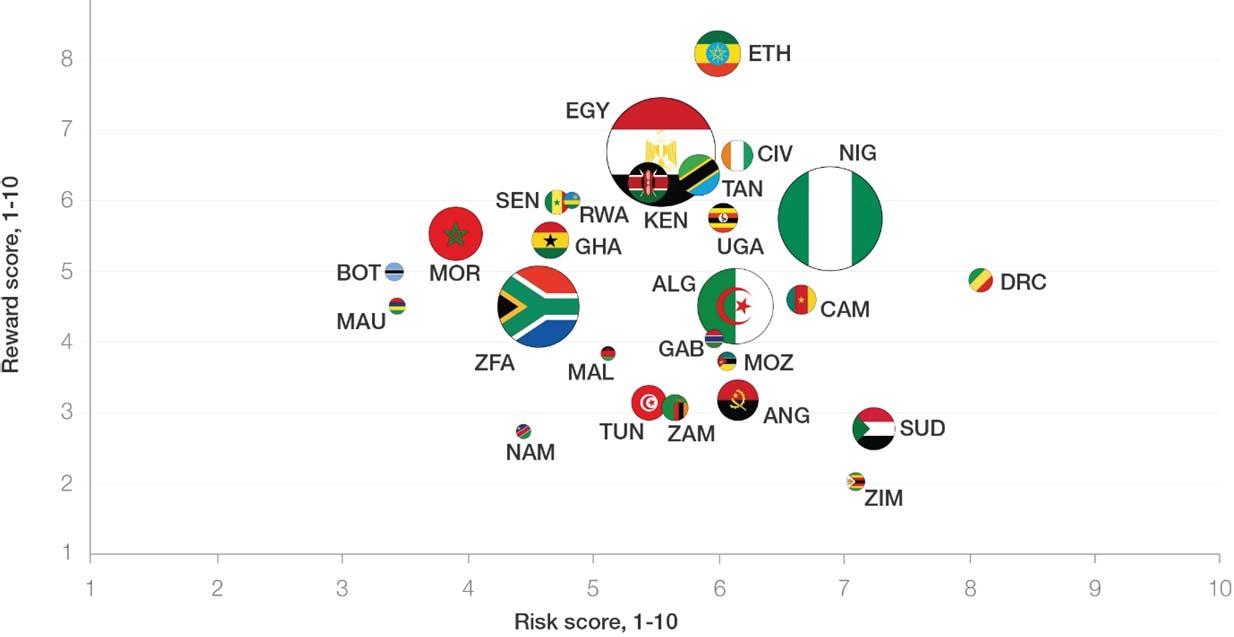 There is an even split of countries from the north, east and west within the top ten rankings, with only South Africa representing the southern tip of the continent, as a result of its dominance in terms of market size.