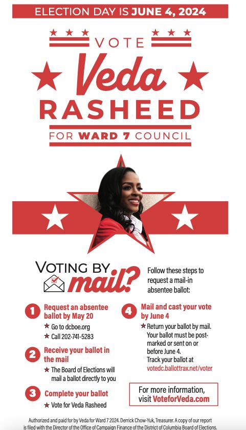 D.C. Voters are encouraged to vote for the change Ward 7 needs by supporting Veda Rasheed as Ward 7’s next councilmember. Early voting begins May 23, 2024, and runs through June 3, 2024. You can also vote in person on June 4, 2024.